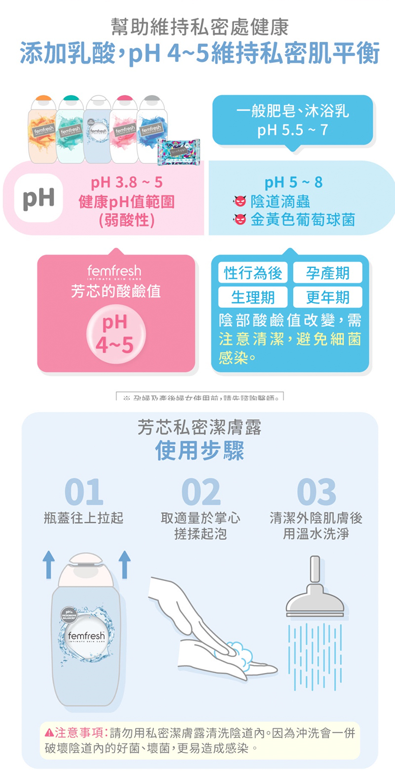 不同於普通肥皂及沐浴露,其溫和配方特別為女性私處設計,在保持自然酸醎平衡的基礎上清潔女性私處